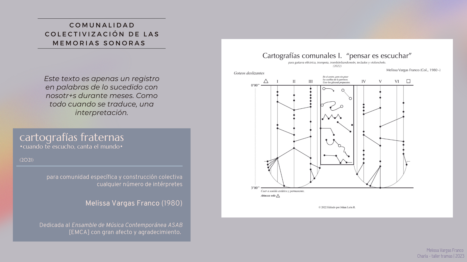Gracias Eliana Monteiro (pianista e investigadora) por la invitaciรณn a participar en la mesa de compositoras con la ponencia: Lo comunal sonoro โ€“ tejer la escucha en una รฉtica creativa.