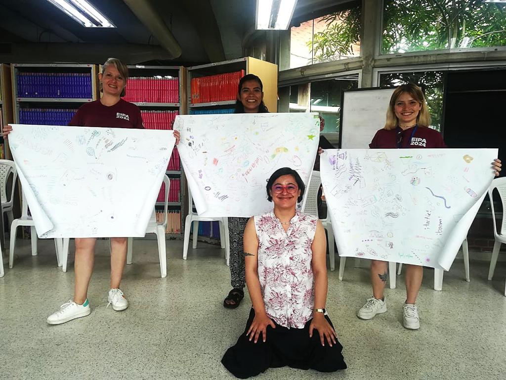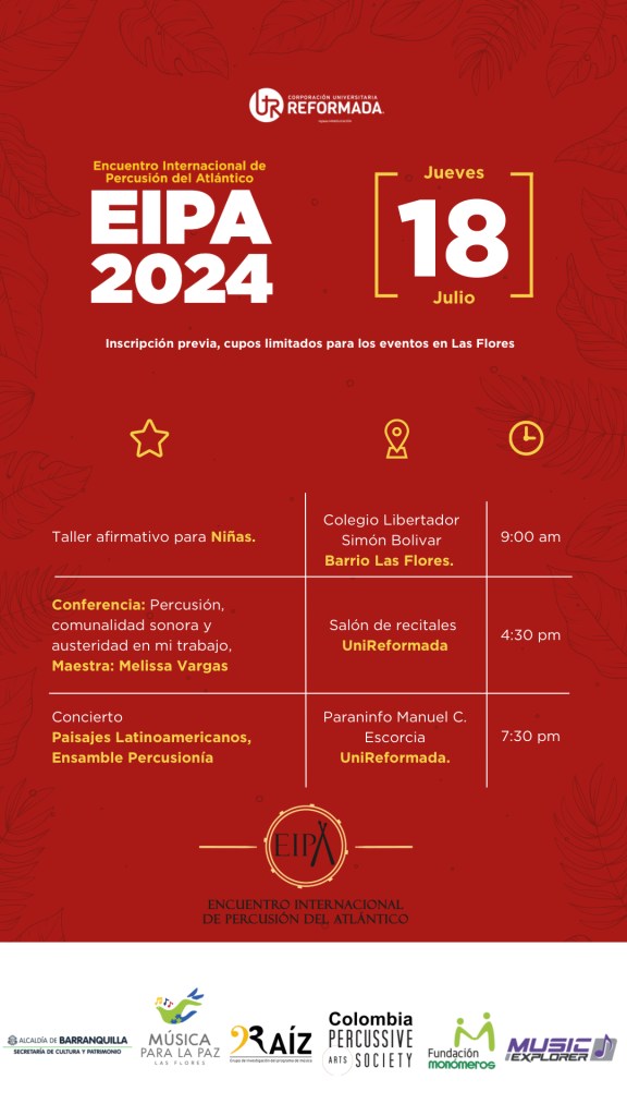 Gracias a la invitaciรณn del proyecto ยซMรบsica para la Pazยป, dirigido por el percusionista Juan de Jesรบs Pรฉrez y la cantante Karen Barraza, realicรฉ en Barranquilla un taller afirmativo para niรฑas y una composiciรณn para improvisar con percusiones en el marco de EIPA Colombia 2024. Ademรกs de la presentaciรณn de una conferencia sobre mi trabajo creativo que involucra la percusiรณn.